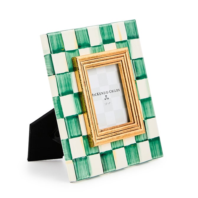 The picture-perfect Emerald Check 2.5" x 3" Frame features hand-painted Emerald Checks on a steel underbody and is backed with linen with a brass logo plate. Its elegant design makes it a stunning way to display your favorite photos or cherished memories, adding a touch of warmth and charm to any room.